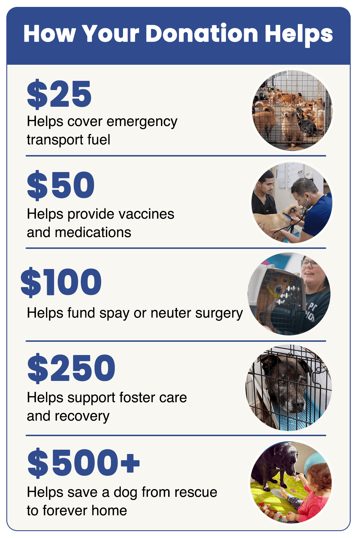 This means 100% of your donation goes directly to dogs in need, and not into paychecks.